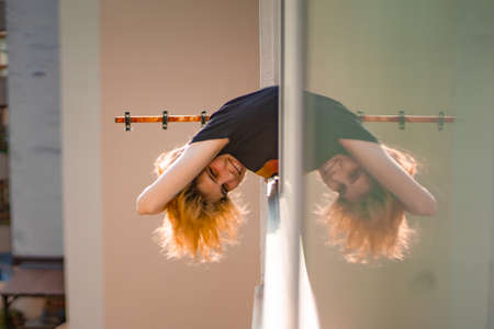 Blonde girl in window in quarantine reflected while corona virus pandemic