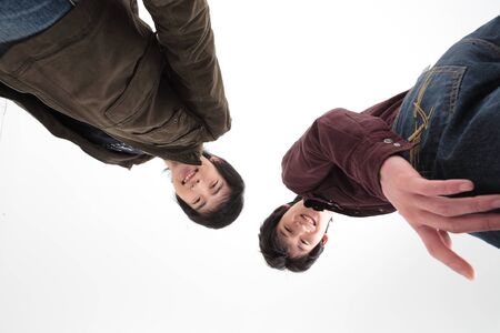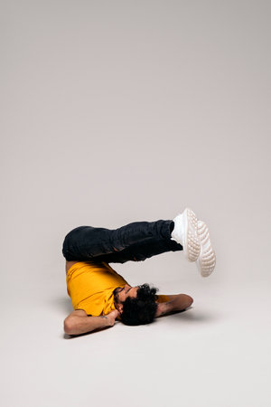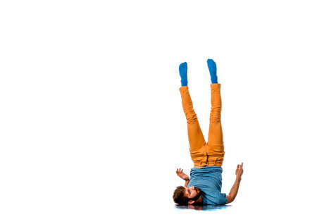 Energetic male dancer wearing casual clothes doing hip hop moves in studio shot against white background.