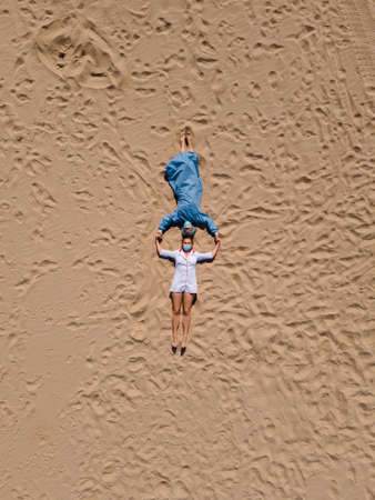 Funny: Two female doctors in medical gear make sand angels lying on beach