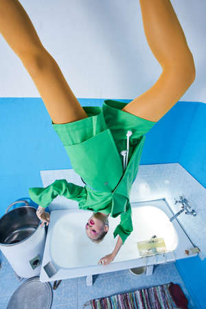 Vertical composite collage illustration of upside down girl legs drawing hole isolated on painted background