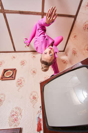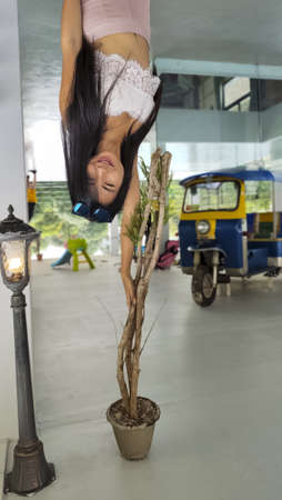 A girl standing upside down touching a plant in a house surrounded by objects and greenery