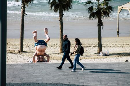Tel Aviv Israel December 31, 2019 View of unidentified people walking on Herbert Samuel Promenade in Tel Aviv in the afternoon