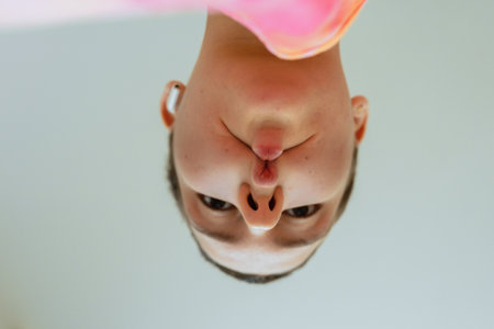 Upside Down Perspective of a Young Woman with Freckles Against a Bright Sky.