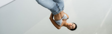 mirror reflection of sexy woman in bralette and jeans standing with hands behind back on grey background, banner
