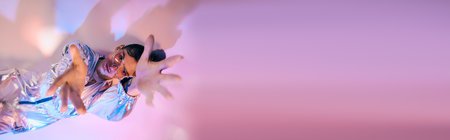 A young woman expresses her individuality in a stunning holographic outfit under colorful lights.