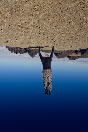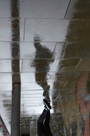 Reflection of a person standing near a puddle. Style is a reflection of your attitude and your personality. The concept of loneliness