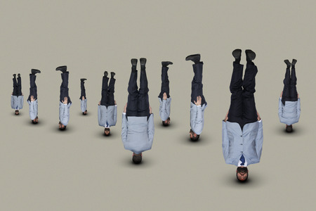 Contemporary art collage, Creative artwork of businessman bangle, fall into nowhere, hole isolated on painting background. Failure. Concept of business, career growth. Copy space for ad.