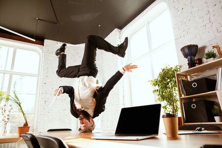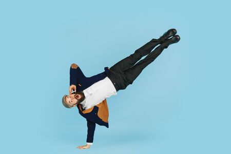 Young caucasian businessman having fun dancing break dance on blue studio background. Management, flexible, freedom, professional occupation, alternative way of modern working. Loves his job. Copyspace.