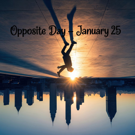 A dramatic and surreal image captures the silhouette of a person appearing to fall upside down against a vibrant sunset sky. Below the person is an inverted cityscape with numerous skyscrapers. The sun is setting or rising on the horizon, casting a warm glow and long shadows. The scene creates a disorienting perspective, suggesting a concept of opposites or a dreamlike state. The text Opposite Day - January 25 is overlaid on the image.
