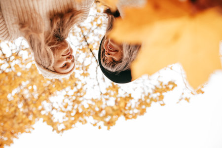 Two happy glad smiling girls, spending time in yellow maple park, weekend activity. Looking gently. Upside down