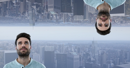 Bright poster of man falling between upside down skyscrapers and sunny green meadow.