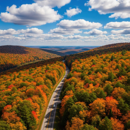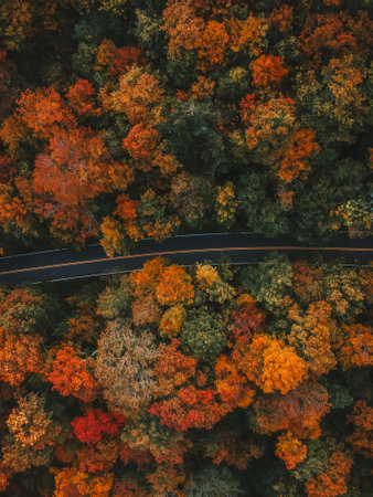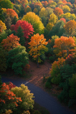 An aerial view captures a tranquil autumn scene with vibrant foliage and a winding road. The colors of fall create a stunning natural landscape perfect for outdoor enthusiasts.