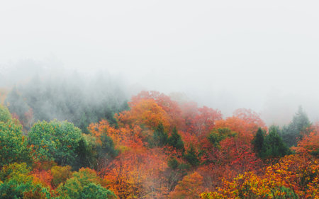 Fall Foliage Colorful Trees Covered in Morning Fog. Moody Autumn in New England. Vermont, USA. Orange, Green, and Red Leaves Scenic Nature Landscape