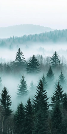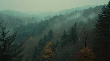 A captivating view of misty mountains adorned with evergreen trees and hints of autumn foliage under a foggy atmosphere, showcasing nature's tranquility.