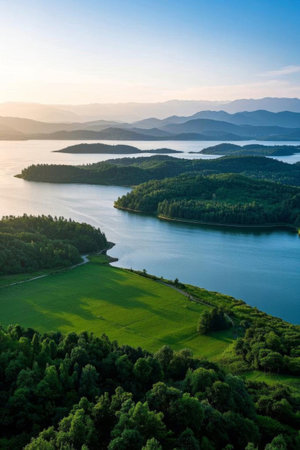 aerial view of forested valley with river snaking through, early morning mist --chaos 30 --ar 16:9 --v 6.1 Job ID: 9bd93815-958b-457a-b49a-26061ad08178