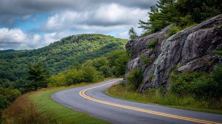 Scenic Mountain Road with Lush Greenery Under Cloudy Sky Perfect for Travel