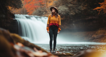 Beautiful woman standing in front of waterfall in the autumn forest.
