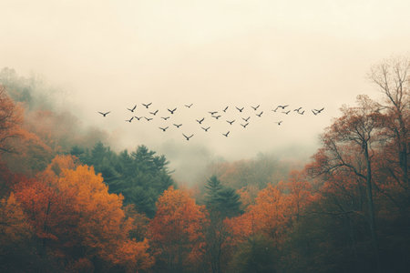 A flock of birds flies over a misty forest in autumn. A mix of orange and green trees adds to the scenic nature background.