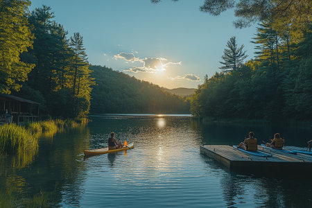 Kayakers enjoy sunset on serene lake