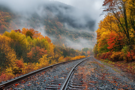 This captivating image features a tranquil railway track disappearing into the distance, flanked by vibrant autumn trees and set beneath a dramatic, cloud-filled sky, evoking a sense of journey and adventure. AI generated image