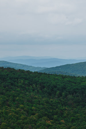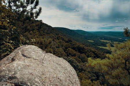 View from top of Stairway to Heaven Trail in the Appalachian Mountains with green pines and summer maple and oak