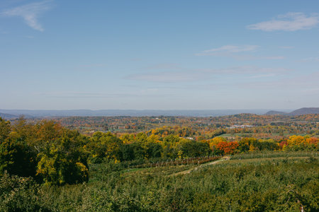 Expansive view of hills covered in autumn foliage under a bright blue sky during a sunny day.