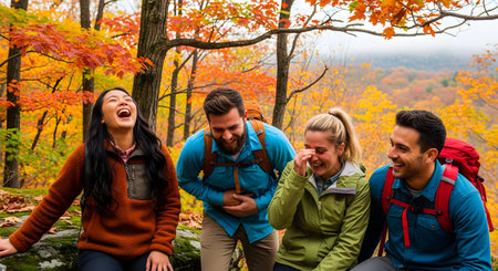 A group of four diverse young friends (two men and two women) are laughing hysterically while taking a break on a hike. They are sitting on a rock in a forest with vibrant autumn foliage (red, orange, yellow trees). They are wearing hiking gear and backpacks.