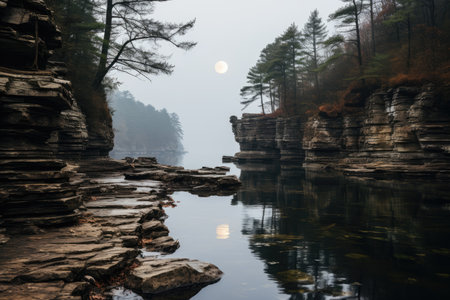 rainy day rocks lake waterfall hyper realism evening professional photography