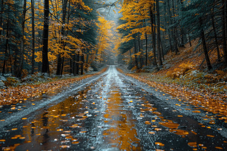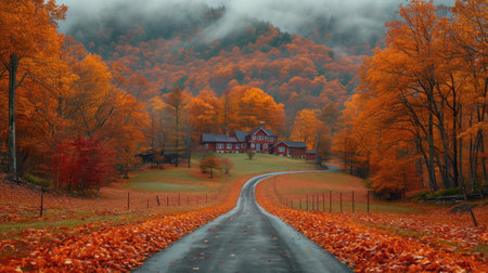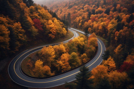 An AI generated illustration of A scenic view of a winding road surrounded by vibrant autumn foliage