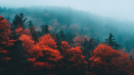 A striking view of a vibrant autumn landscape showcasing bright orange leaves contrasting with lush green trees, enveloped in a soft morning mist. Perfect for nature lovers.