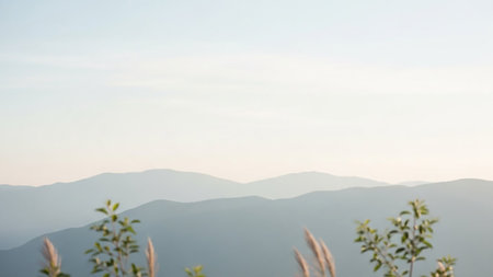 A soft focus image of layered mountain ranges fading into the distance under a pale, hazy sky. In the foreground, out-of-focus green leaves and wispy grasses add a gentle frame to the expansive natural vista. The light suggests early morning or late afternoon.