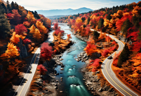 Scenic Autumn Road Along River with Vibrant Fall Foliage in Mountain Landscape..