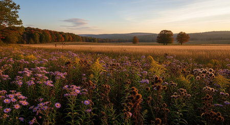 Sunset on the meadow with colorful autumn flowers in the foreground.