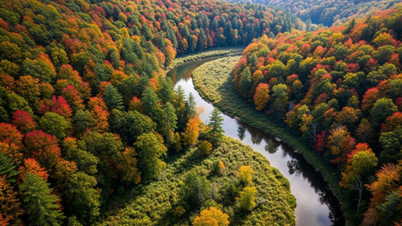 An aerial perspective reveals a winding river flowing through a dense forest ablaze with the vibrant colors of autumn. The trees display a spectrum of red, orange, yellow, and green foliage, creating a rich and textured canopy. The river's surface reflects the colorful surroundings, adding to the picturesque and serene beauty of this natural landscape. The scene evokes a sense of untouched wilderness and seasonal splendor.