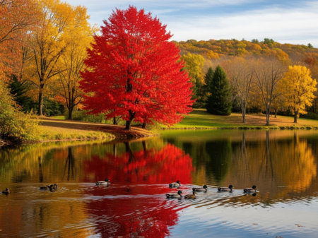 A vibrant autumn scene featuring a large red tree reflected in a calm pond, surrounded by other colorful foliage and ducks swimming peacefully.