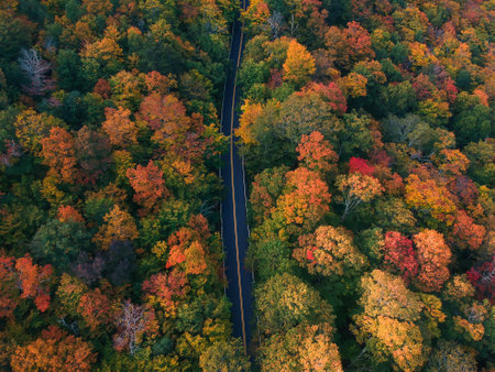 An aerial view captures a tranquil autumn scene with vibrant foliage and a winding road. The colors of fall create a stunning natural landscape perfect for outdoor enthusiasts.
