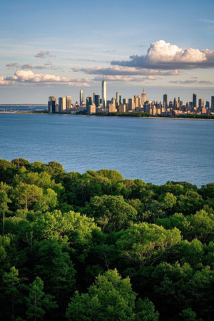 Generative AI Aerial view of Manhattan skyline at sunset, New York City