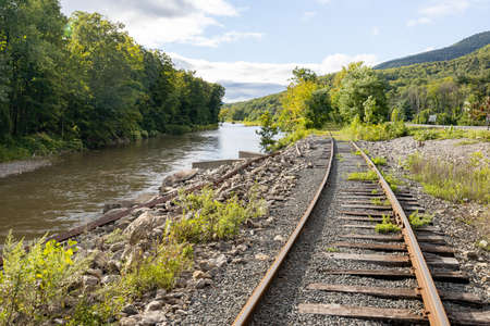 Autumn in New England Landscape Photography Beautiful River Runs Through Colorful Fall Foliage Forest Fog and Clouds in Distance Early Morning
