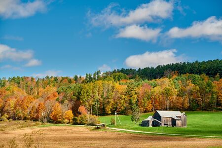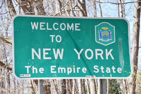 Beautiful seasonal fall color over the highway sign that welcomes travelers to New York