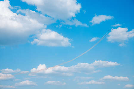 Blue sky white clouds and vapour trail in the evening of the longest day of the year summer solstice in Brighton UK