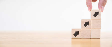 Ladder career path for business growth success process concept.Hand arranging wood block stacking as step stair with arrow up. Panoramic image