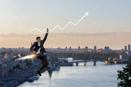 Businessman is flying and holding a growth arrow against the backdrop of the city.