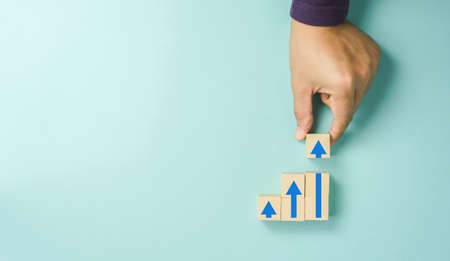 Ladder career path for business growth success process concept. Hand arranging wood block stacking as step stair with arrow up