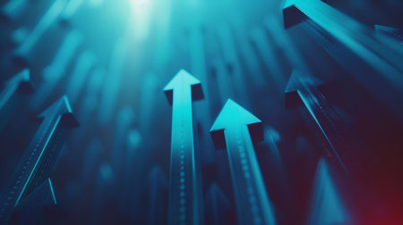 Dynamic upward arrows symbolize growth and progress, illuminated with vibrant colors against blurred background. This conveys sense of optimism and forward momentum in business or finance