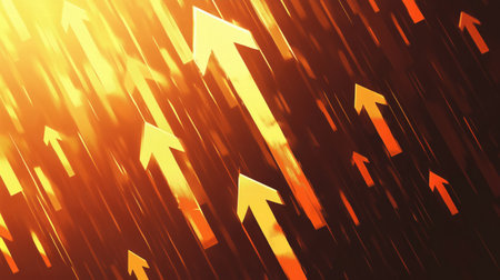 Dynamic abstract background featuring glowing orange arrows pointing upwards, symbolizing growth and progress. dark backdrop enhances vibrant colors, creating striking visual effect