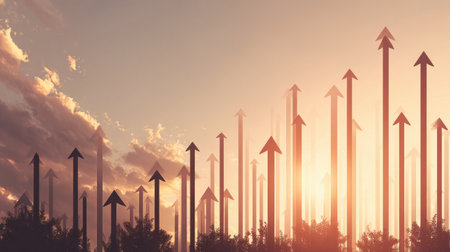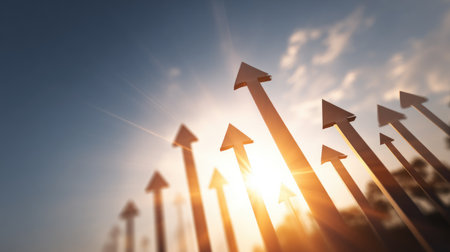 Vivid image featuring arrows pointing upward against a bright sky, capturing themes of growth and success illuminated by radiant sunlight. Perfect for motivational themes.