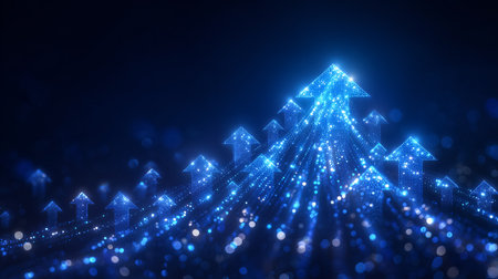 This abstract digital image features glowing upward arrows set against a dark background, symbolizing growth and success illuminated by sparkling particles.