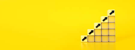 Uptrend with yellow arrow up from stacked wooden cubes. Concept for bullish market and growth.