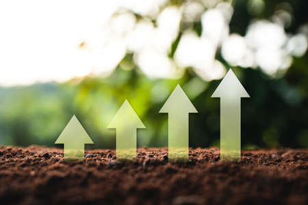 An upward arrow symbolizing the growth of sustainable investment, representing green finances and environmentally responsible investing.