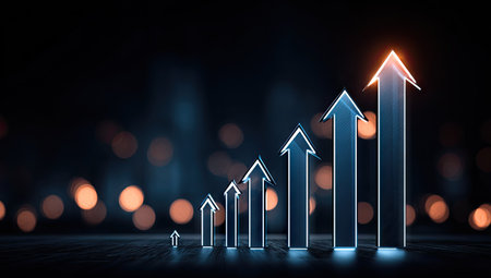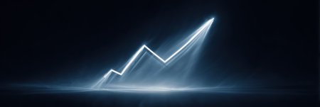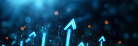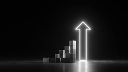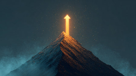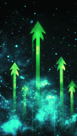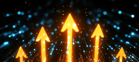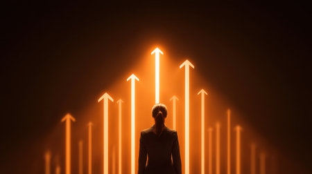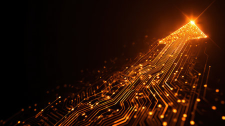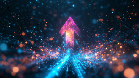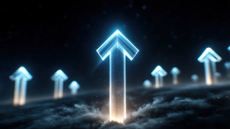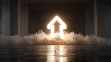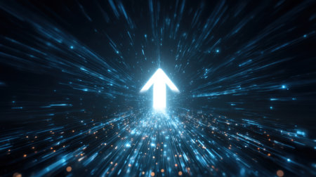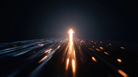 A sleek, luminous corridor with a radiant arrow ascending amid rows of advanced servers, evoking innovation and digital growth in a modern tech enviro
